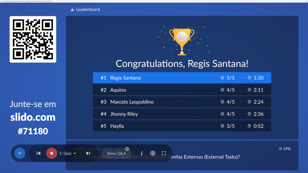 No App Slido informe Nome e Sobrenome para sua identificação e eventual envio de brindes. Evite entrar como anônimo para fazer perguntas e participar do Quiz.